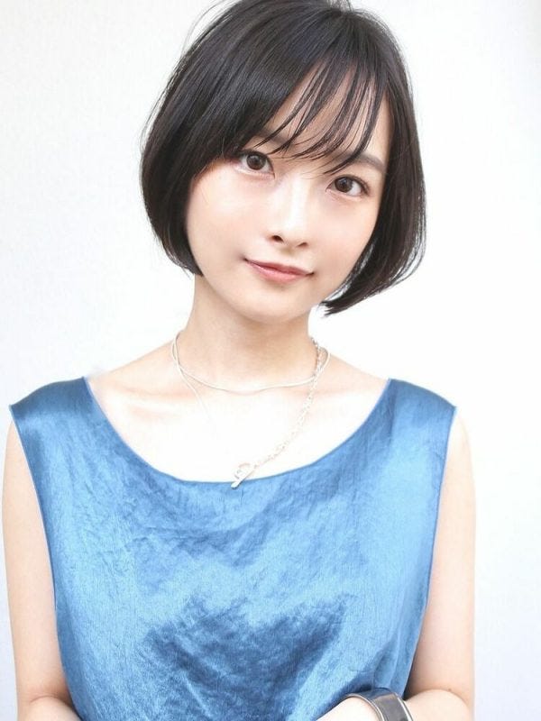 シンプルで大人っぽい長めショート。ボブに近い髪型で黒髪ですが、前髪なしにするとすっきり仕上がり重くなるのを防げます。