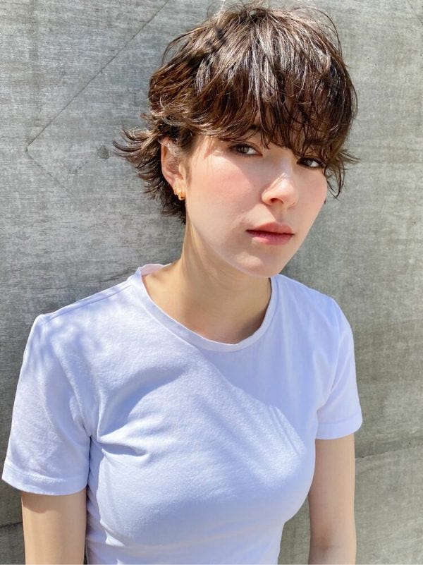 パーマで馴染ませると伸ばしかけの長めショートでもグッと垢抜けたヘアスタイルに。
