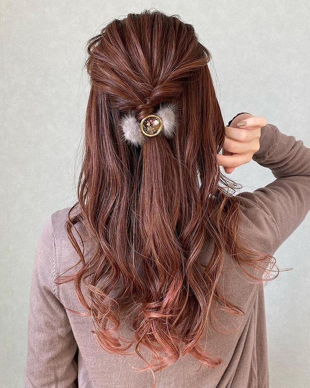 ロングのハーフアップにファーアクセでアクセントをつけた髪型。一気にヘアスタイルが華やかになるファーアクセは、入学式の髪型におすすめのアイテムです。