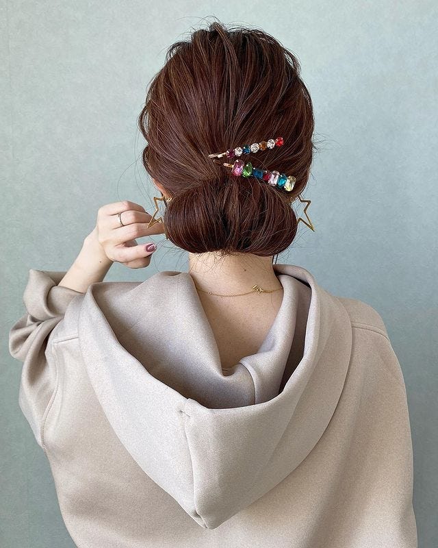 落ち着いた印象になる低め位置のお団子は、派手になりすぎないのにおしゃれなヘアスタイルでおすすめですよ。