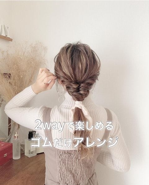 残った髪を全部一緒にして少し三つ編みして結び、全体の毛束を引き出して、ゴムを毛束で隠したら完成です。
