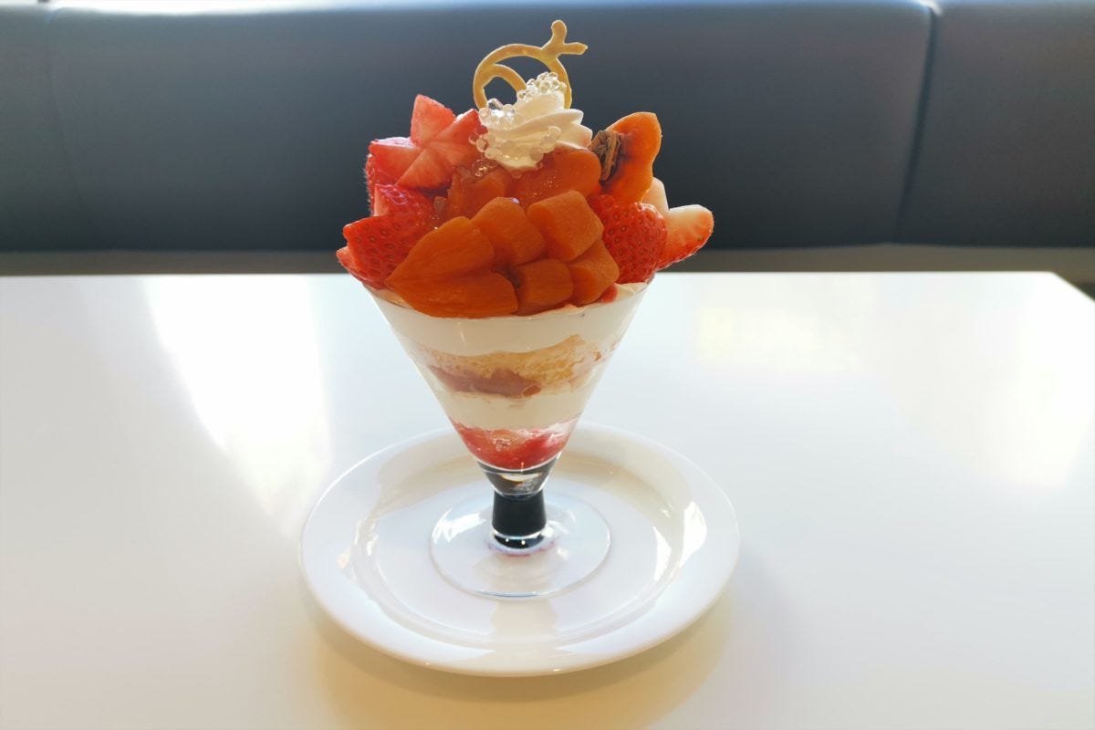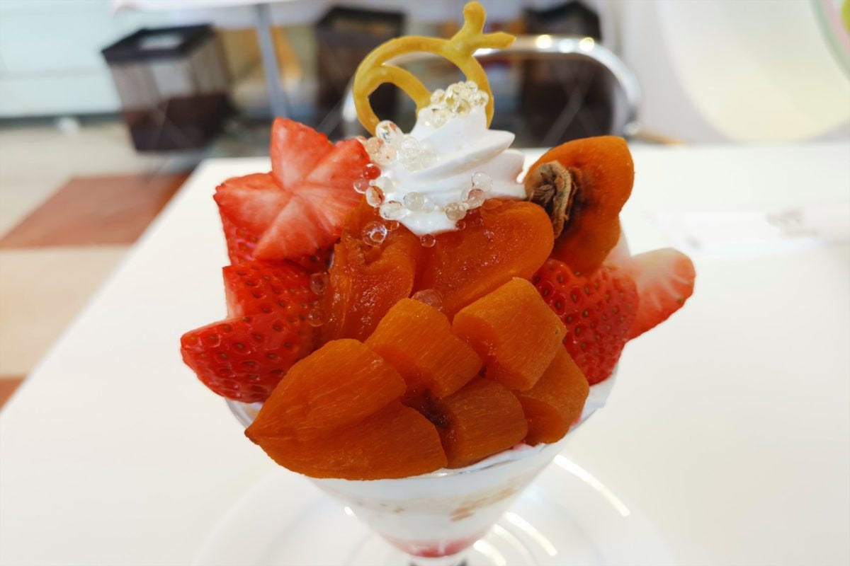 そのパフェとは、ふくしま冬のフルーツで登場した「あんぽ柿とふくはる香のパフェ」。