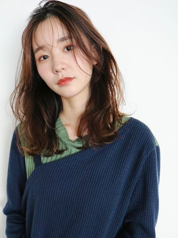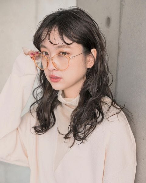 ゆるいウェーブの長い流し前髪で、丸顔の輪郭をカバーできるロング。