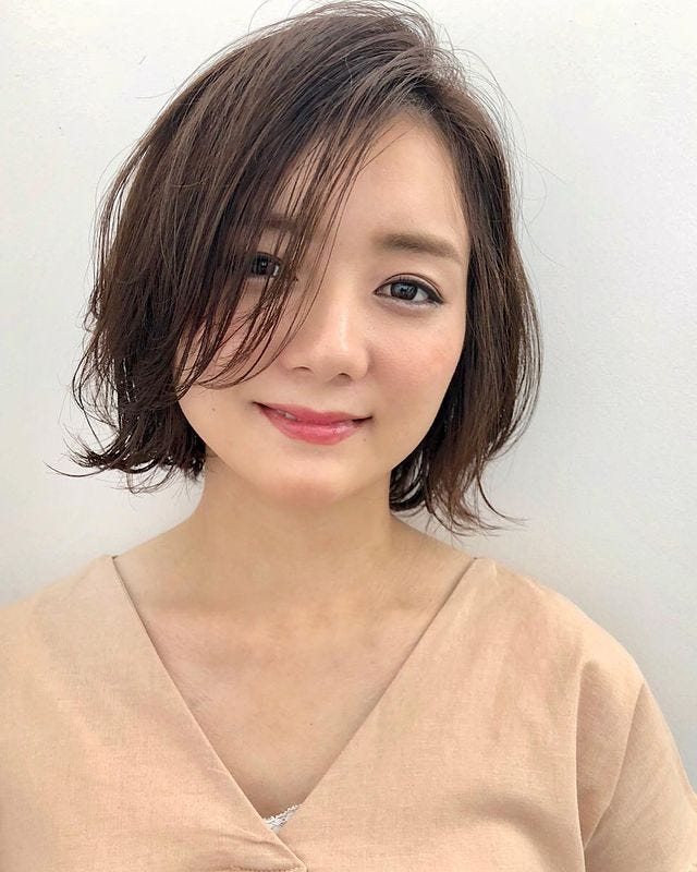 長い前髪を横に流した大人なボブも、丸顔の輪郭がカバーできる髪型です。
