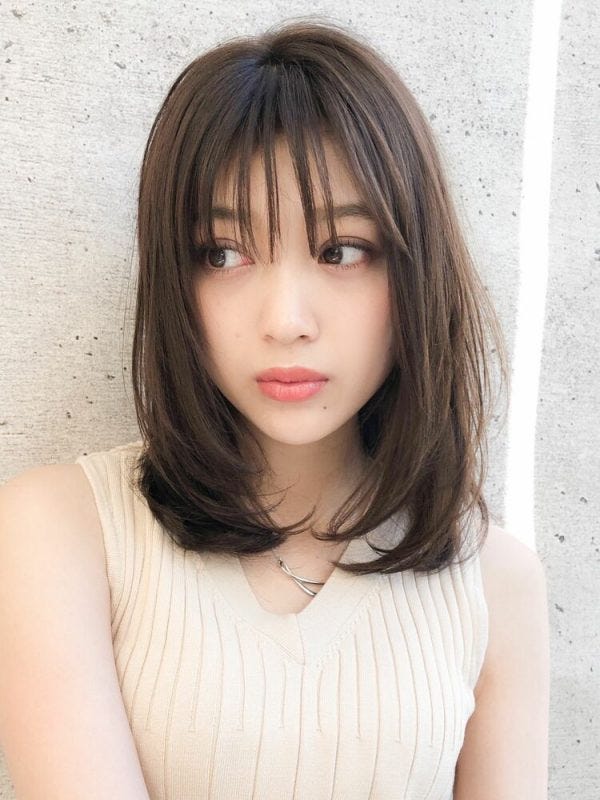 黒髪ストレートヘアのシンプルなミディアムですが、顔まわりにレイヤーを入れると横幅を狭く見せるので丸顔の輪郭カバーができますよ。