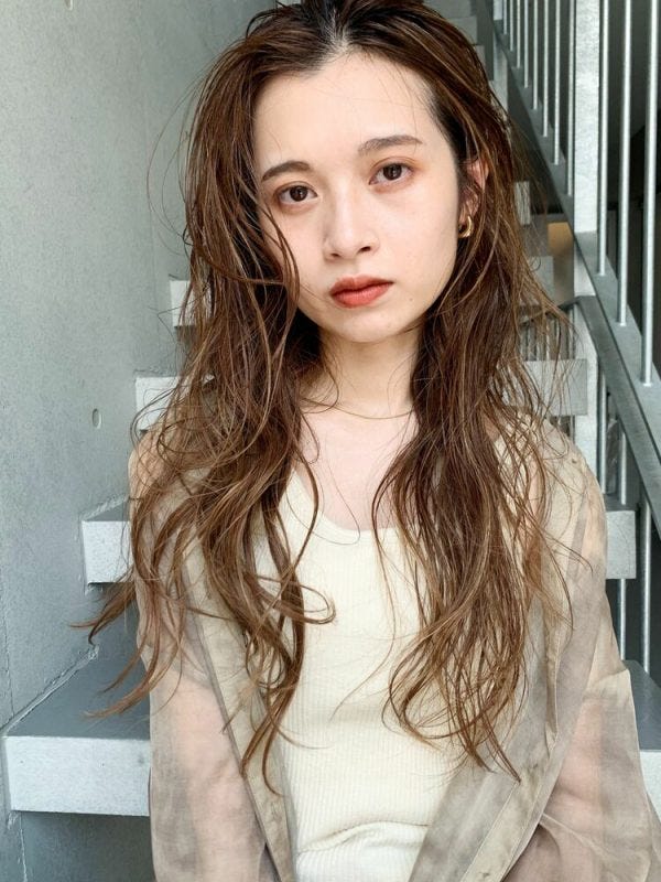 大人女性に人気のウェット質感ロングも、丸顔の輪郭カバーができる髪型です。