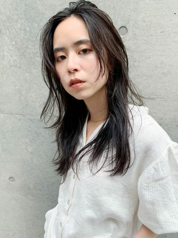 黒髪ロングはレイヤーたっぷりにして、顔まわりにも動きがつくようにラフにセットすれば、丸顔の輪郭がぼやけてうまくカバーできます。