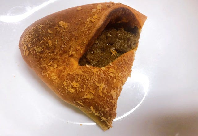 一般的なカレーパンは、分厚いパン生地がカレーを包み込んでいる商品が多いですが、こちらの商品はパン生地が薄いです。