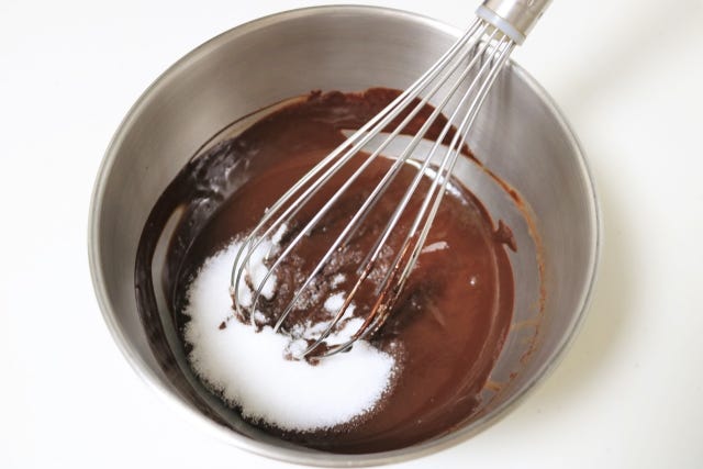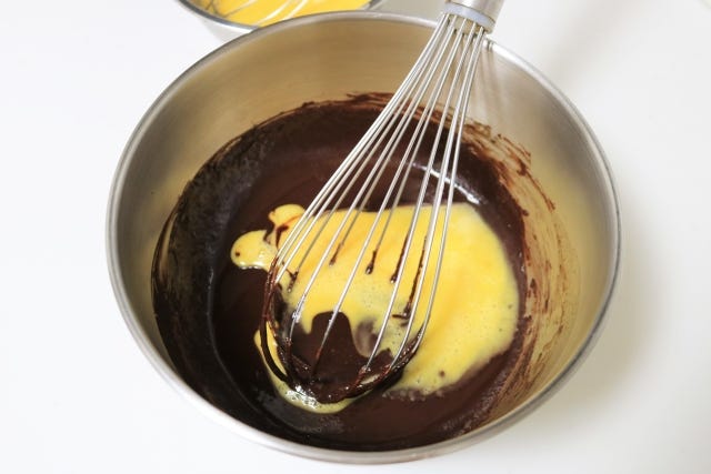 ① ボウルにハイカカオチョコレートと無塩バターを入れて湯せんで溶かす。チョコが綺麗に全て溶けたらラカントSを加えて混ぜる。