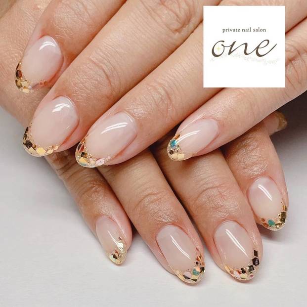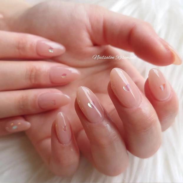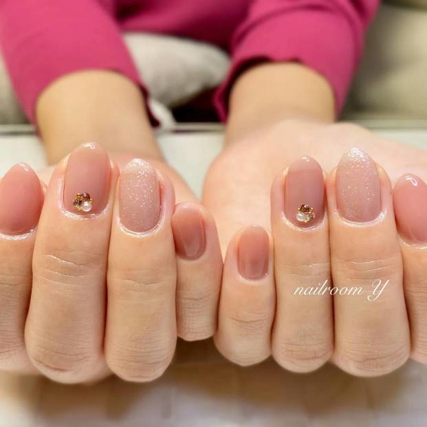 透け感のあるベージュカラーと繊細なラメが、爽やかな2月におすすめのショートネイルデザイン。