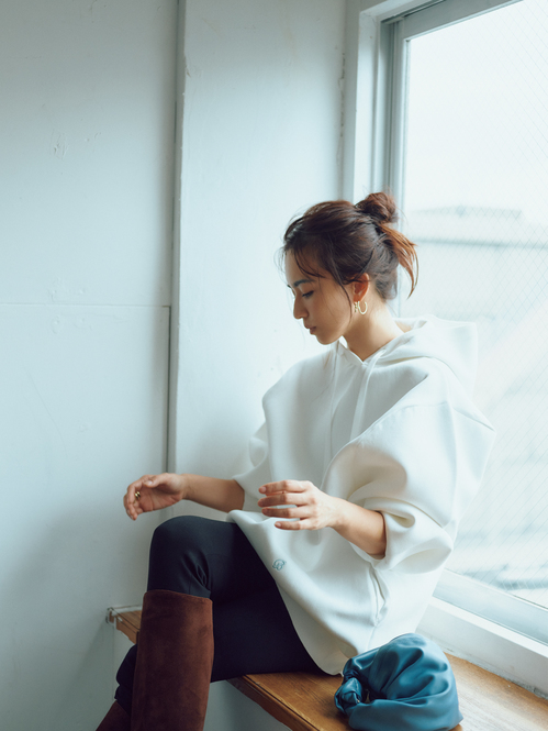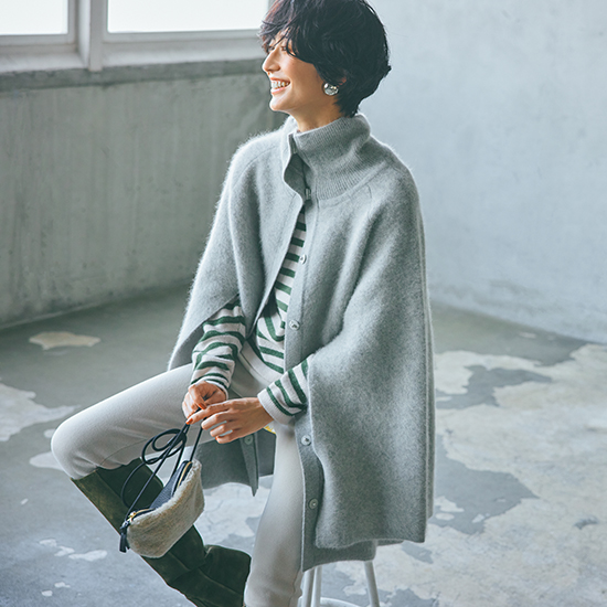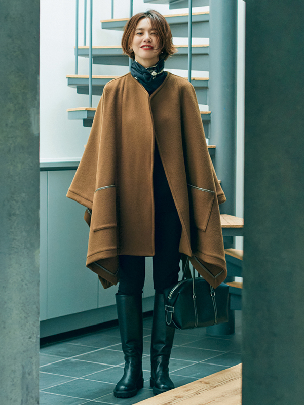 ポンチョ¥31,900(エトレトウキョウ)バッグ¥9,790(アトリエブルージュ)中に着たセーター¥31,900(アリュード/三喜商事[アリュード])パンツ¥17,600(ebure/ebure GINZA SIX店)イヤリング¥3,150(アビステ)ブーツ¥33,000(ダイアナ/ダイアナ 銀座本店)