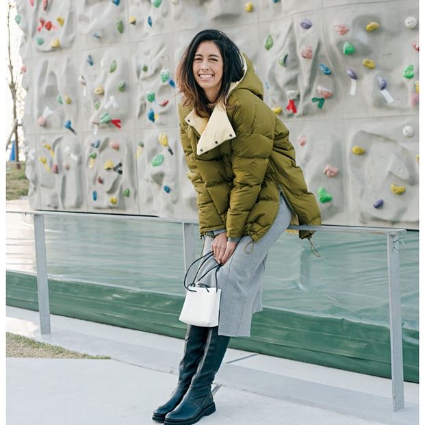 淡色レイヤード×ロングブーツの ワントーンで縦ライン強調がコツ。 着痩せ&防寒も万全