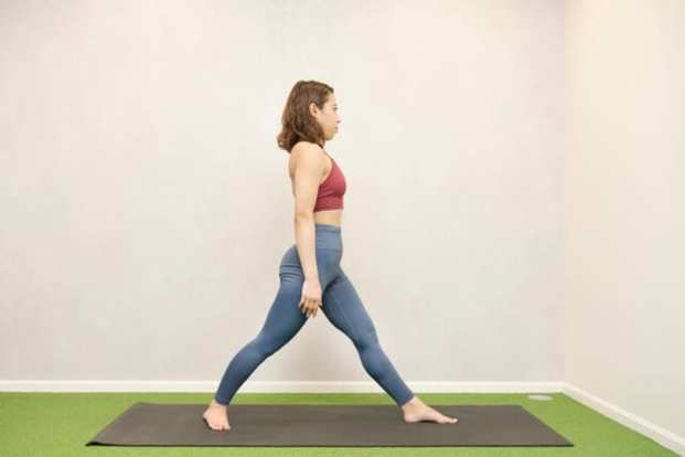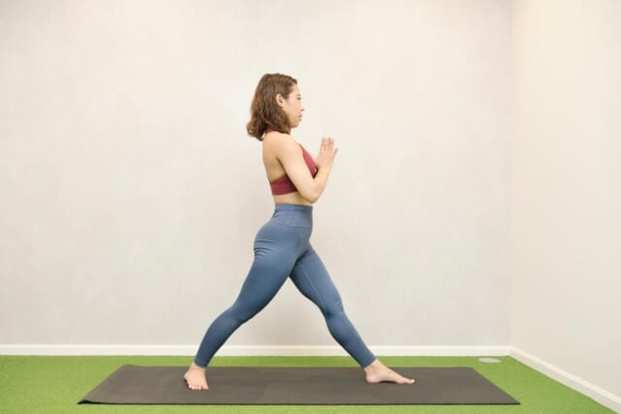 反対側も同様に行います。なお、期待する効果をきちんと得るためには「脚を大きく後ろに引く際も前脚のひざを曲げる際も、常に骨盤をまっすぐ正面に向けたままにすること」がポイント。また、不自然に肩が上がってしまったり、腰が反ったりしないように注意しましょう。