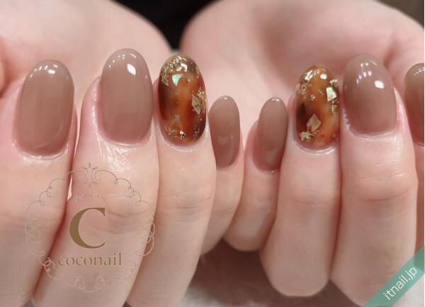 濃いめの「ベージュ」のワンカラーと、ワンポイントでべっ甲柄ネイル。ダークな色合いの「ベージュ」なら、冬の寒い気候にしっくりと馴染んでくれます。べっ甲柄には金箔を飾り付けて、華やかさをプラス。大人の女性に相応しい、シックな指先にまとまっています。