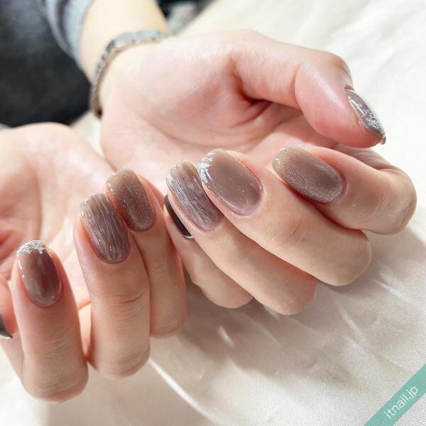「グレージュ」をベースにしたラウンドカットに、シルバーを使用したアートがオシャレなデザイン。縦に筋状に伸びるアートは指先をより長く見せてくれます。カジュアルなファッションにも合わせやすい、とってもスタイリッシュな仕上がりですね。