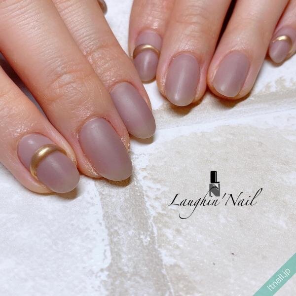 こちらは「グレージュ」を使用した、ワンカラーのマットネイル。マット仕上げにすることで、「グレージュ」がさらに落ち着いたカラーリングに変化しています。ゴールドミラーで描いたリングデザインをワンポイントに、品のある華やかさが魅力的なデザインです。