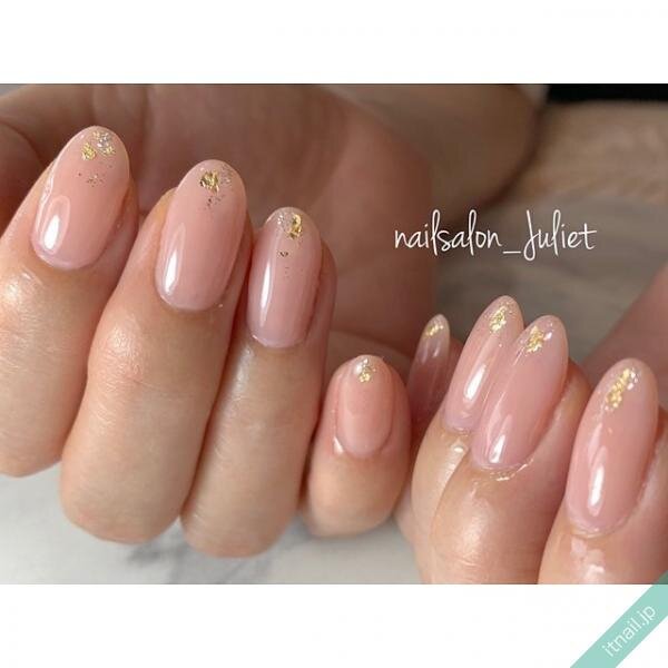 指先を最も華やかにエレガントに見せることのできるミディアムレングスのオーバルカットをベースにしたピンクベージュネイル。「ピンクベージュ」のワンカラーと、ネイルエッジには金箔・銀箔をあしらったゴージャスなデザインが目に留まります。デートネイルにもおすすめの可愛らしい仕上がりです。