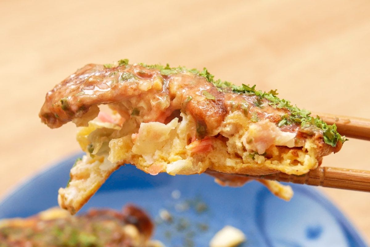 お好み焼き粉の粉っぽさはまったく感じず、するすると口に入っていく。お好み焼きをめぐっては「ご飯のおかずになるか問題」があるが、これならおかずとしても食べてもおいしそう。