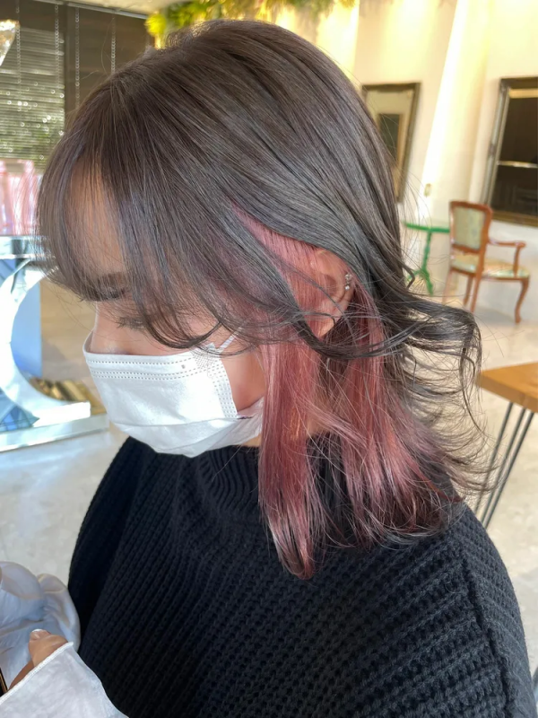 ダウンスタイルで髪の毛を下ろしていればピンクのインナーカラーが目立ちませんが、耳掛けなどのヘアアレンジをすると明るいピンクベージュと暗髪の対比が引き立ち、ブリーチありで染めた美しいカラーを楽しめます。