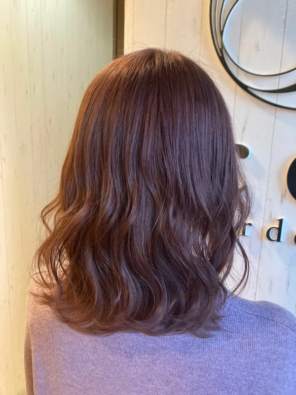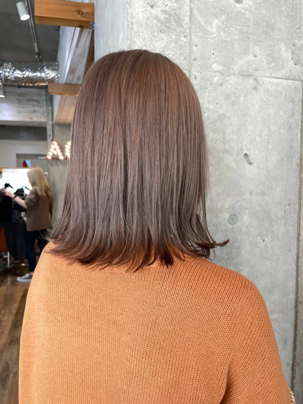 アッシュも混ざったピンクベージュなので透明感があり、厚めのミディアムヘアでも軽やかな印象になりますね。