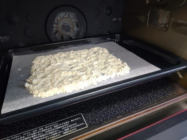 ・●の粉をあわせ、オーブン天板にクッキングシートを敷いて粉を空焼きし冷ましておく。(120℃予熱あり25分)
