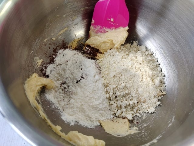 ④ ③に●の空焼きした粉、ホットケーキミックス、ココアを入れゴムベラで切るように混ぜる。粉っぽいのが見えなくなったらOK。