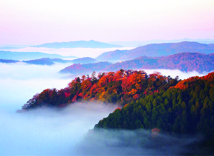 市街地の北端、標高約430mの臥牛山の一角に城郭を残す山城。大手門付近を中心に周辺の木々が秋化粧するその姿は圧巻。秋は雲海が発生することが多く、雲上で見物できるかも!