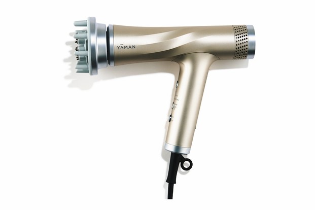 大風量で髪を乾かすドライヤーに、表情筋を刺激する振動と化粧品の浸透を高めるイオン電極を搭載したアタッチメントが付属。サイズ:W5.8×H18.3×D20.1cm 414g 55,000円(ヤーマン 0120-776-282)