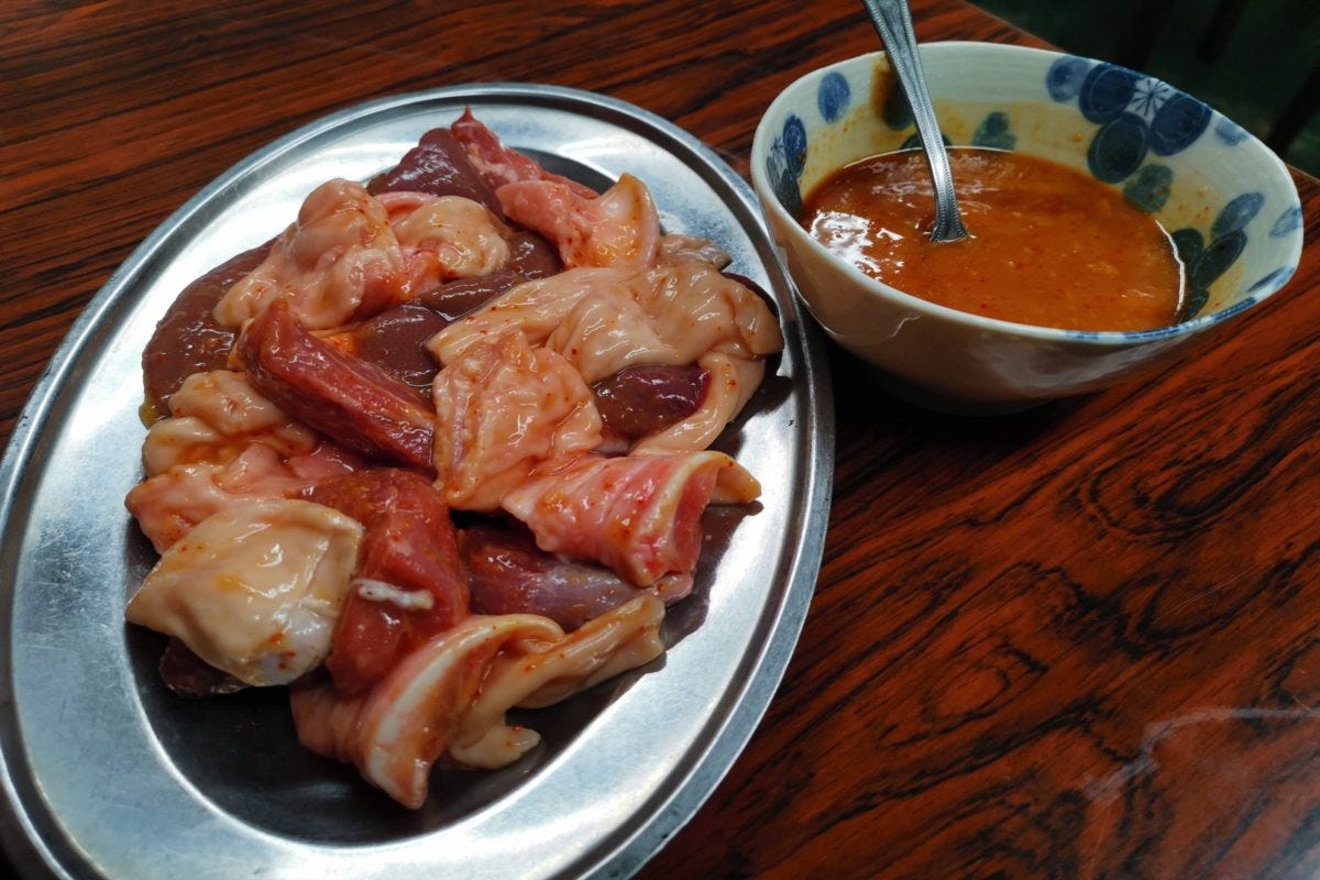 ホルモンはどれも新鮮で臭みが無いのだが、それ以上に凄いのがこの味噌だれ。月並みな表現だが、魔法のような味でこれにつければすべてのホルモンが究極に美味しくなってしまうのだ。