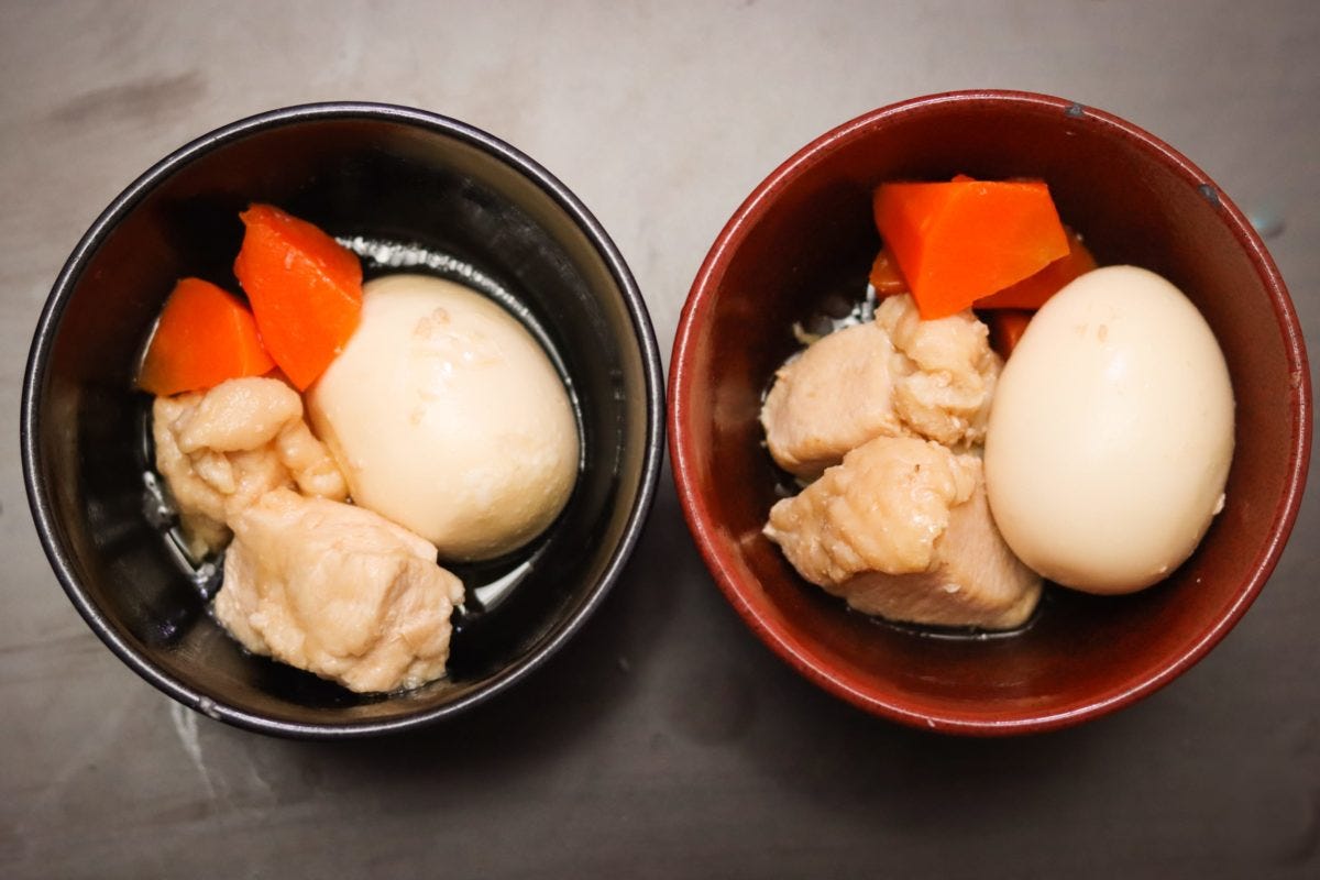 煮物の味付けの指定はないため醤油、みりん、酒といった王道の調味料を用意。材料は鶏胸肉のほか、大根がなかったため人参、卵でいざ挑戦。