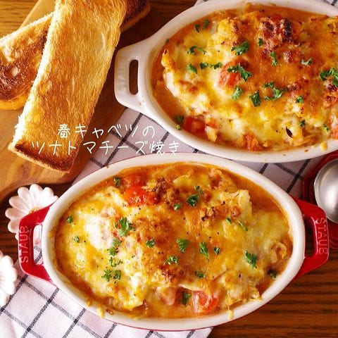 そこでおすすめしたいのが、春キャベツのツナトマチーズ焼きです。焦げ目が食欲をそそるおしゃれな副菜で、野菜たっぷりで食べごたえもあります。