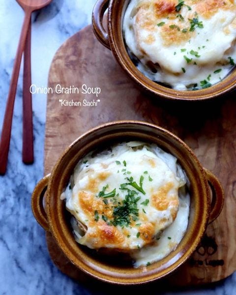 バゲットを使ったオニオングラタンスープは、豪華で食べごたえがあり、充実したアスパラベーコンの献立になります。