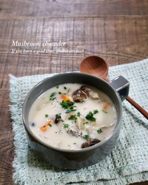 きのこチャウダーは、アスパラベーコンの献立に風味や旨みをプラスしてくれます。