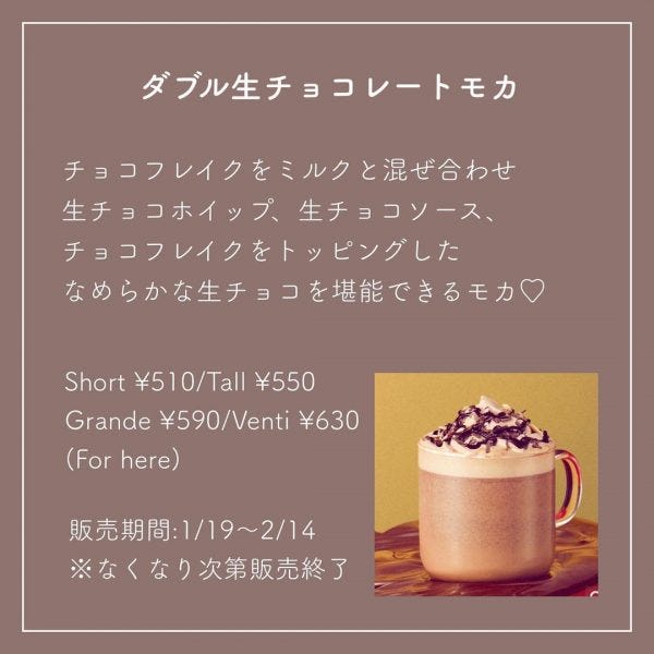 バレンタインまでの限定ドリンク「ダブル生チョコレートモカ」の本当に美味しすぎるカスタム3選を紹介します。