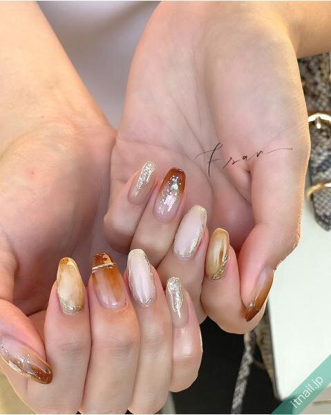 落ち着いたニュアンスネイルにするなら、ブラウンをメインにしてみて♡カフェラテのようなニュアンスネイルを意識するとおしゃれです。先端側に入れたリングも目を惹きますね。