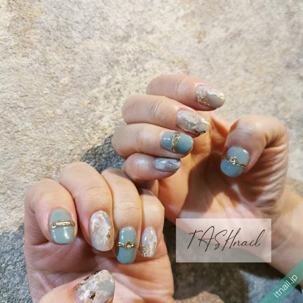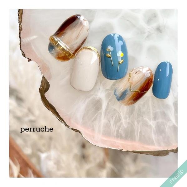 ブラウンとブルーというちょっと変わった組み合わせのニュアンスネイルは、個性的でおしゃれ上級者感が漂うデザインです♡ホワイトを混ぜているので、爽やかに見えるのも魅力のひとつ!立体感のあるリングや、ゴールドのうねうねラインで素敵なアクセサリーネイルにしてみてください。