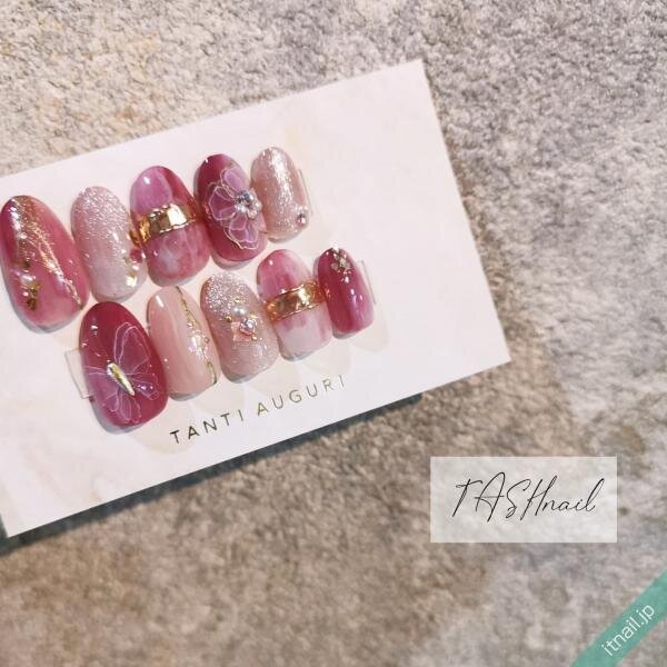 ピンクや赤、白のタイダイ柄に指輪をのせるだけでなく、たらしこみネイルによるお花や蝶々を入れれば、華やかな仕上がりになります。特別なシーンでも楽しみたくなる可愛いネイルですね♡