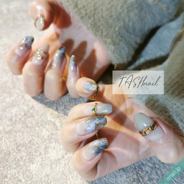 くすみブルーのグラデーションネイルも、ニュアンス感を出したいときに人気!ベースがシンプルなので、凸凹リングや重ねたリングで存在感を出し、指輪を主役にするのがおすすめです。