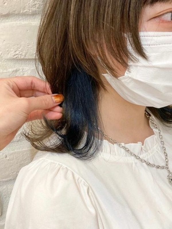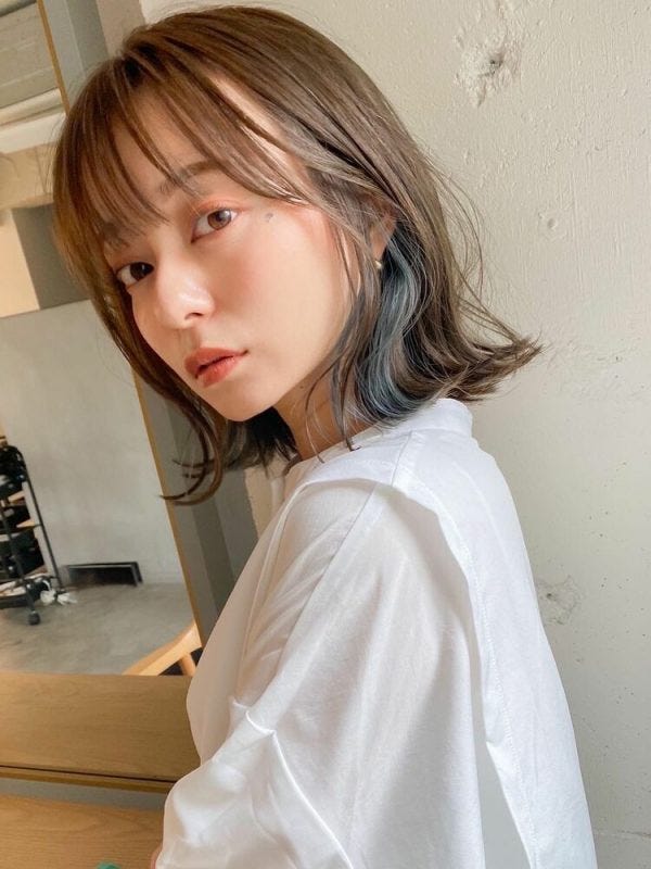 肌の明るさや透明感が際立つブルーのインナーカラーは黒髪と合わせるとクールに決まりますが、親しみやすさを加えたい女性はブラウンと合わせてみて。