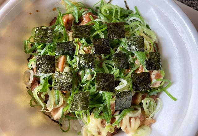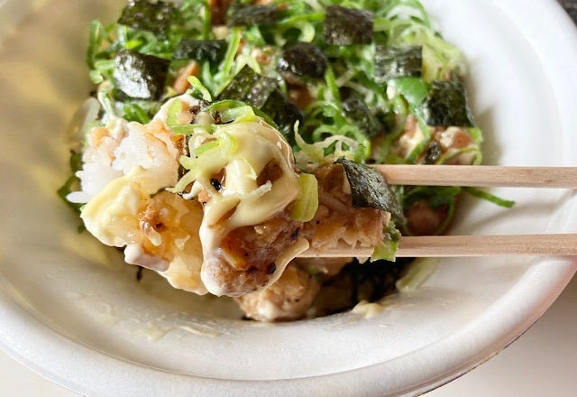 ご飯の上に焼き鳥が乗っていて、上からマヨネーズとネギがかかっています!