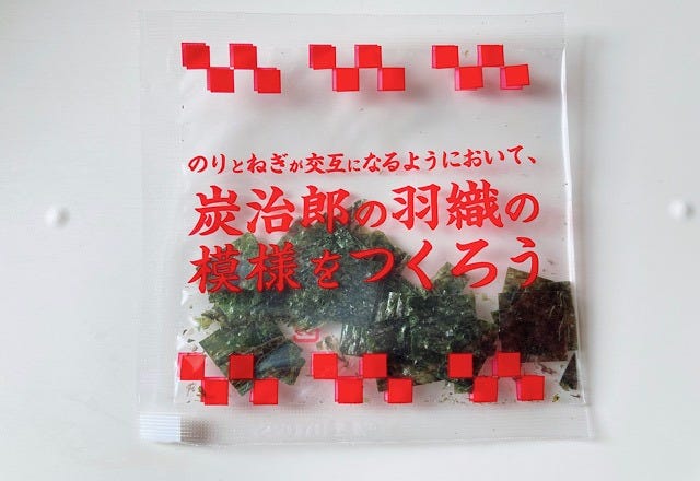 のりのパッケージには『炭治郎の羽織の模様をつくろう』と書かれていて、自分でのりを交互になるように置いて完成させるようです!