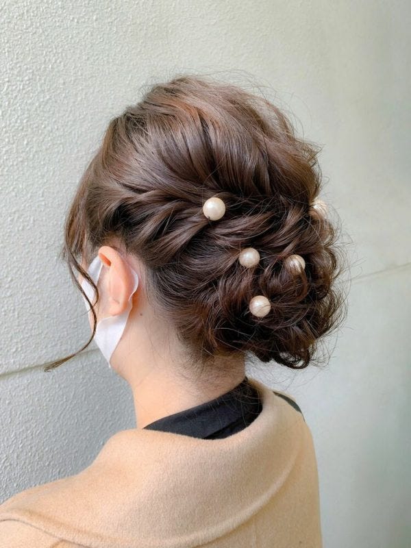 お団子を取り入れた大人っぽいミディアムアップには、パールが似合います。