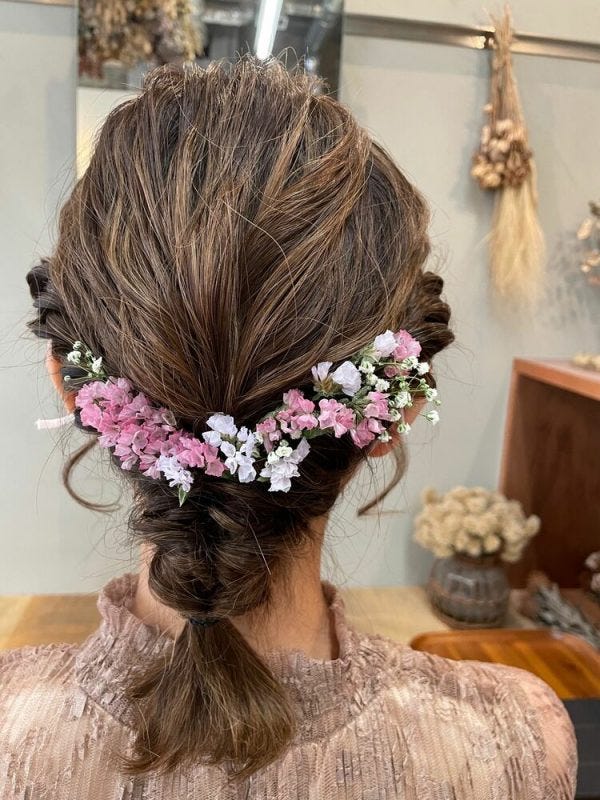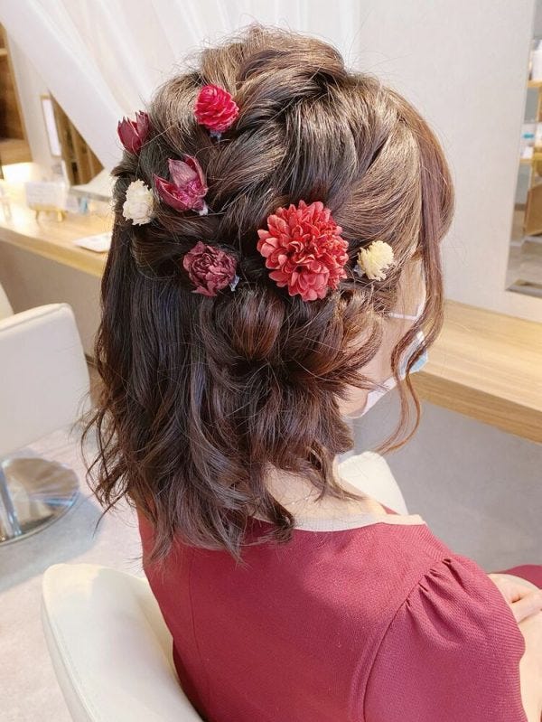 こちらのミディアムヘアは結婚式のお呼ばれヘアアレンジらしく、お花をデコレーション。
