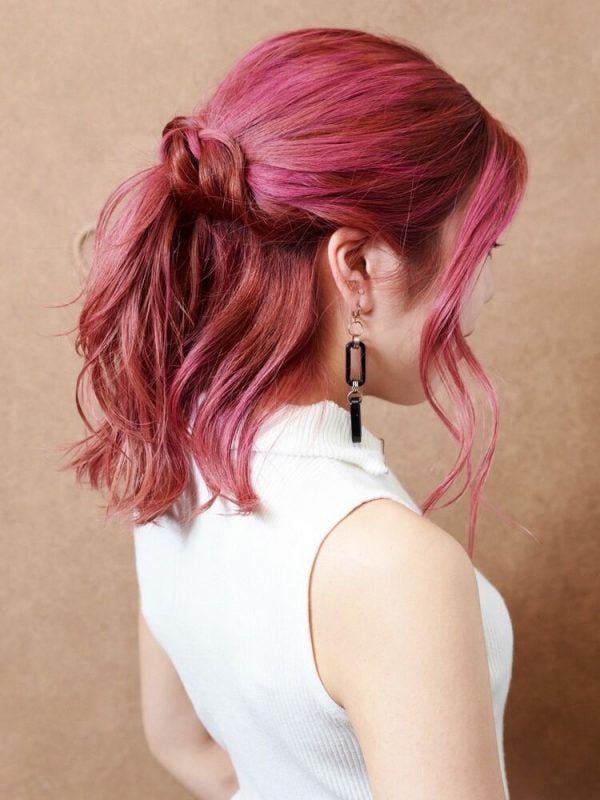 続いてのお呼ばれヘアも、くるりんぱを取り入れたポニーテールアレンジです。甘いピンクカラーもポイント。