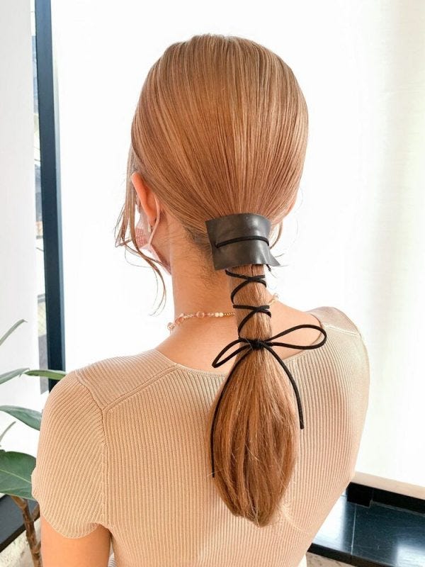 束ねた部分にブラックレザーを巻いて、さらに革紐で結んでいます。カジュアルなミニドレスやパンツスタイルにも、おすすめのお呼ばれヘアです。