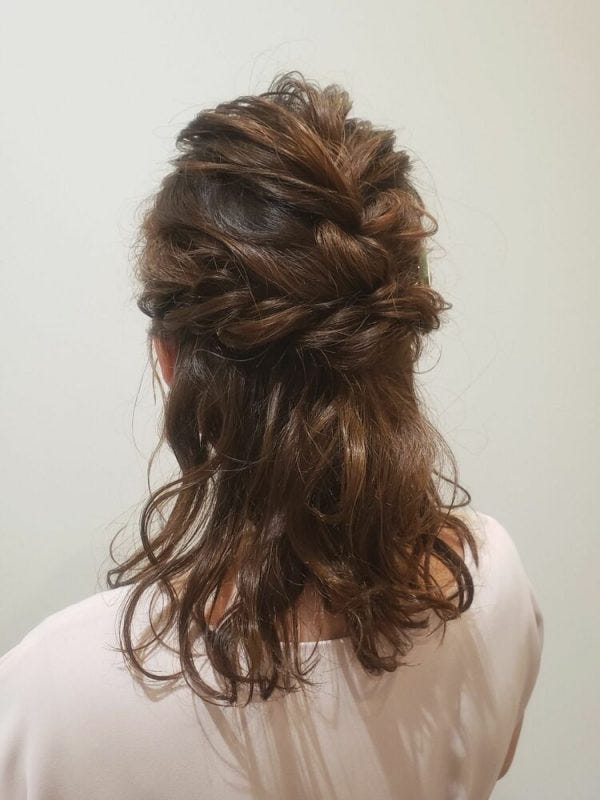ヘアアクセサリーがなくても、編み込みやツイストをミックスしたミディアムアレンジは、お呼ばれヘアらしい華やぎが出せます。