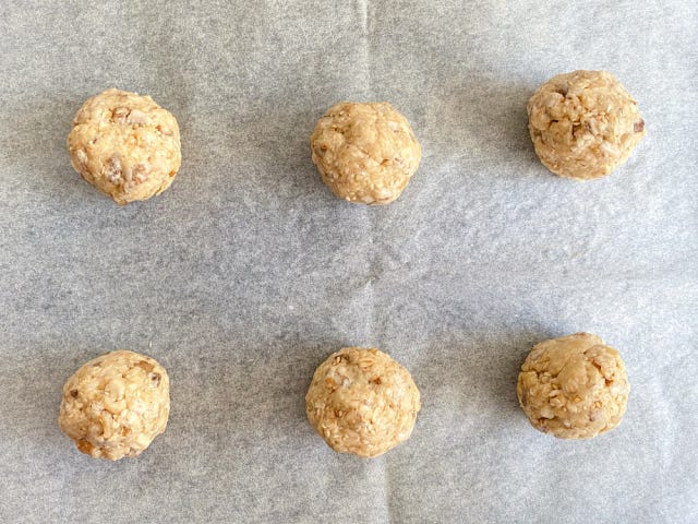 ④ 6等分にして丸め、クッキングシートを敷いた天板に並べて平らにする。