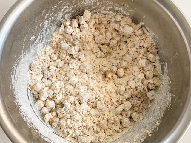 ③ メープルシロップ、無調整豆乳、オリーブオイルを加え、ゴムベラで全体を切るように混ぜてまとめる。