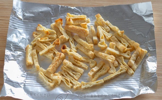 ② 油揚げは、キッチンペーパーでおさえて油分をとり、オーブントースターで軽く焼き色が付くまで焼く。