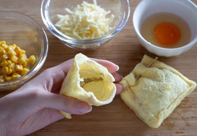 ① 油揚げは、キッチンペーパーで抑えて、油分をとる。半分に切って、破れないように開く。コーン、チーズ、卵を中に入れて、楊枝で縫うように止める。